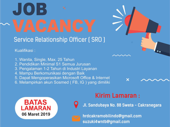Lowongan kerja: ASPR ABC President MATARAM Lokasi kerja: lombok timur - Pria - Pendidikan min SMU - Umur Max 30th - Punya SIM A fan HP...